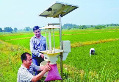 日前,在江苏南京高淳桠溪镇镇南村的水稻田里,村民正在查看杀虫灯。据悉,当地推行“绿色植保,光控防治”,利用太阳能杀虫灯防治上百亩水稻病虫害,确保水稻生长优质、安全、无农药残留。
