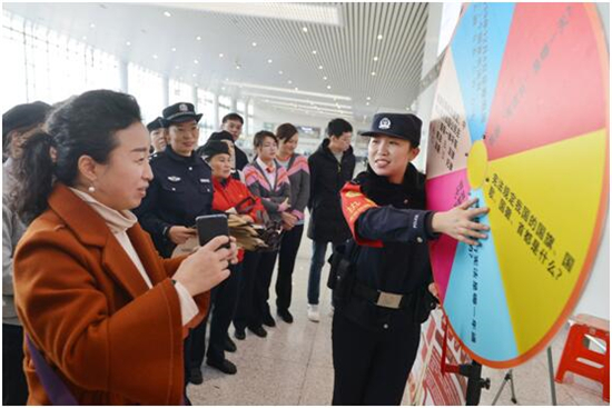 民警在候车室里跟旅客进行宪法知识大转盘问答游戏