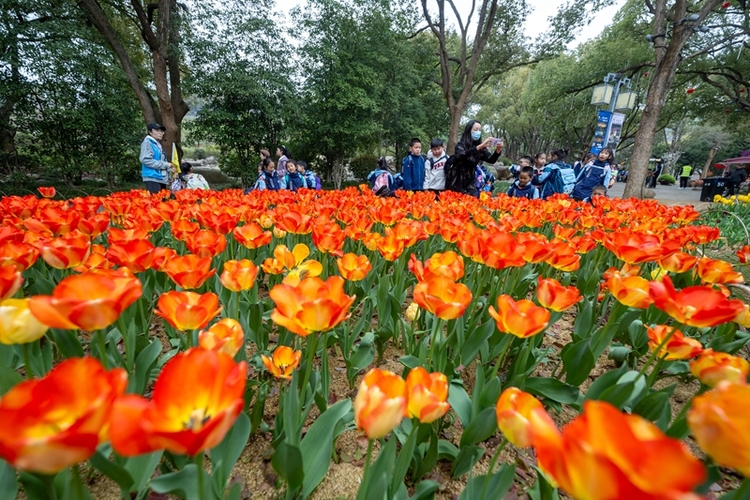 近日,市民在梅园景区观赏郁金香。2024年梅园景区郁金香文化艺术节的郁金香从荷兰原装进口,品种近30多个,十万余株郁金香用花传情,展现繁花似锦、春意盎然的美好画卷。(无锡新传媒 宗晓东 摄)