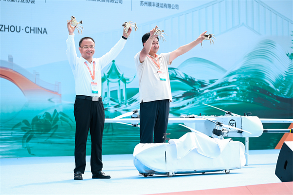 上午10点,开捕启动仪式将现场气氛推向高潮。接着,由一群水乡蟹嫂带来的阳澄渔歌保留曲目《卖蟹谣》,以其朴实、感人、亲切的风格赢得了现场观众的热烈掌声。在万众瞩目下,场内嘉宾和场外观众通过直播镜头,共同见证2025年第一篓阳澄湖大闸蟹出水时刻,金色晨曦中蟹农把蟹笼扬起,一只只肥美鲜活的大闸蟹争抢爬行,丰收喜悦感染全场。随后,无人机编队将首批大闸蟹精准空运至主舞台,展现“低空经济+传统蟹业”的创新融合。现场还通过直播镜头,全景展示专卖店标准化作业流程——从捆扎、包装到冷链运输,每一个环节都彰显出阳澄湖大闸蟹产业链的精细化与专业化,让消费者买得放心、吃得安心。