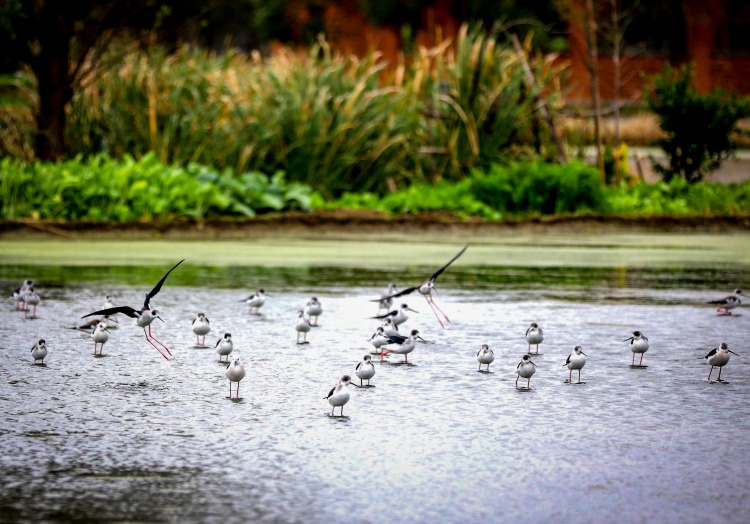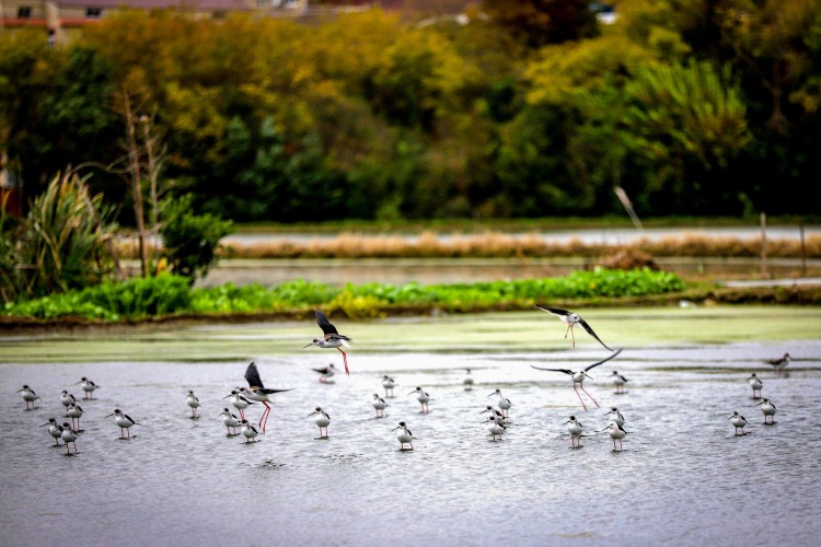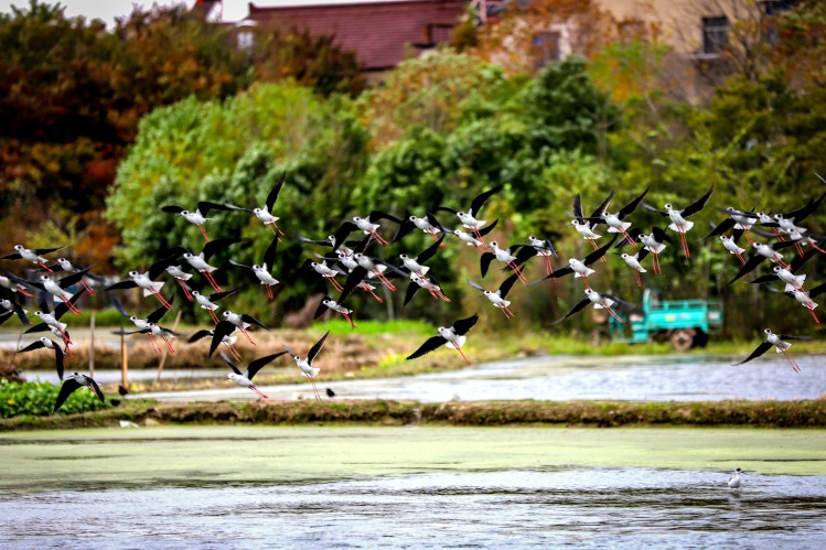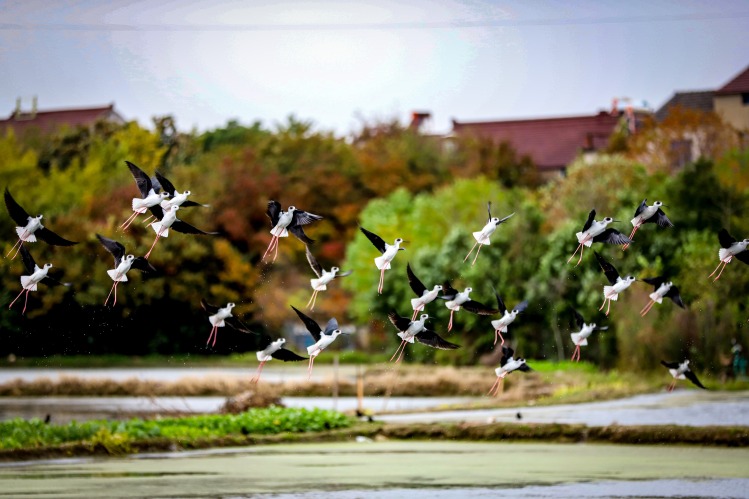 11月18日,南京高淳永宁村水塘迎来黑翅长脚鹬越冬群。灵动身影衬着乡野塘景,尽显生态之美。近年当地护水护绿,已连续多年吸引该物种来此栖息。成为乡村生态向好的鲜活注脚。(南京日报/紫金山新闻 记者 段仁虎)