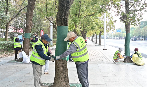小雪到,冬始俏。在淮安市清江浦区城南街道迎宾大道两旁,身穿绿马甲的园林工人们给行道树裹上绿色纤维布。两人一组,麻利地将布从树干2米左右的位置向下缠绕,手法娴熟,仿佛在给树木披上温暖的“绿衣裳”。