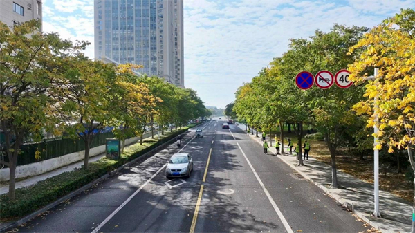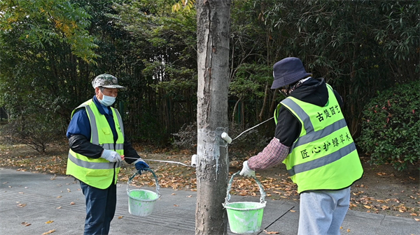 “要涂白均匀,高度一致,不留死角。”“树皮缝隙、孔洞等区域,需要反复涂刷到位。”在毓秀路两旁,园林工人在技术员的指导下,手持滚轮蘸取特制杀菌涂白剂,对路边栾树、无患子、榉树等落叶树种进行逐一树干涂白。作为冬季绿化养护的核心环节,树干涂白不仅能帮助树木抵御低温冻害,还能有效防止蛀干害虫产卵,为树木穿上了“双重防护衣”。