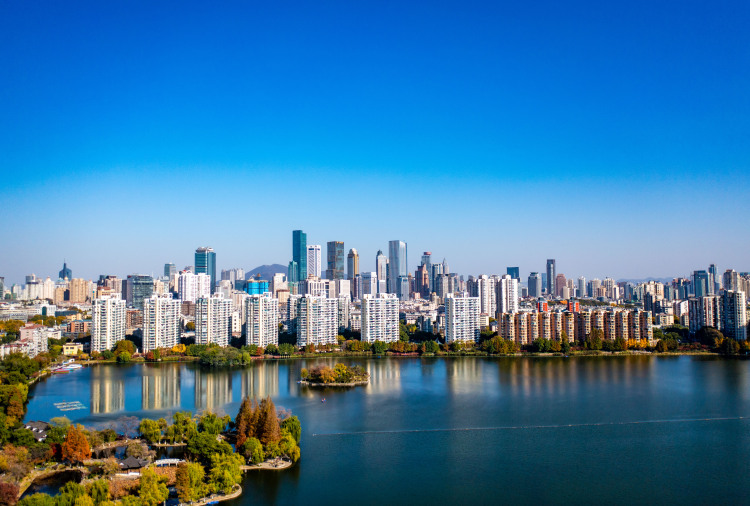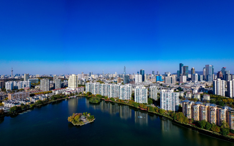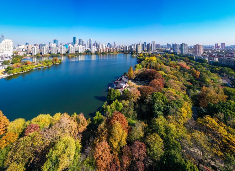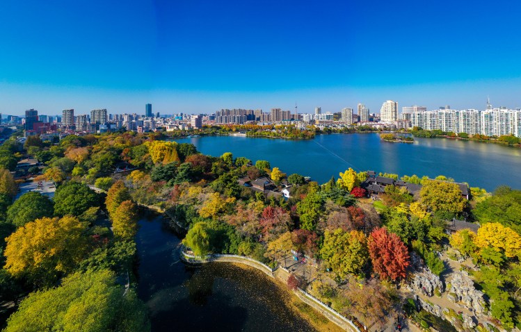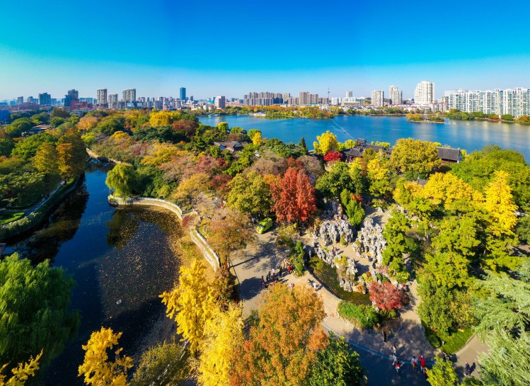 11月25日,南京天气晴朗,碧空如洗。此时,迎来高颜值“水晶天”。碧水蓝天映衬下的莫愁湖公园,勾勒出初冬时节色彩斑斓的生态画卷。呈现出天蓝、地净、岸美、水清的宜居城景。(南京日报/紫金山新闻 记者 段仁虎)