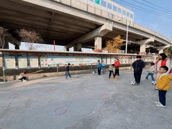 广场上更是热闹非凡。志愿者提前布置好简易球场,准备了10余个足球、套圈、彩色标志桶和贴纸、拼图等奖品,游戏简单易操作又趣味十足。孩子们脚踩“西瓜籽”,或灵活带球避障,或默契配合腾挪“瓜地”,在趣味互动中锻炼了身体协调性,更懂得了协作的意义。志愿者全程引导秩序,为完成挑战的孩子贴上小红花、发放奖品,让大家在欢乐中感受足球魅力,在协作中体会团队力量。