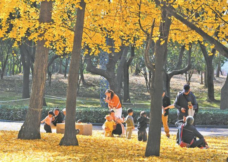 12月8日,在金城湾公园一处银杏赏景点,金色银杏落叶在树下铺满一地,吸引市民前来拍照打卡。相关部门实行“落叶不扫”,最大程度地保留自然落叶景观,让市民感受这份冬日的诗意与浪漫。图为市民带着孩子在银杏树下游玩。(还月亮 摄)