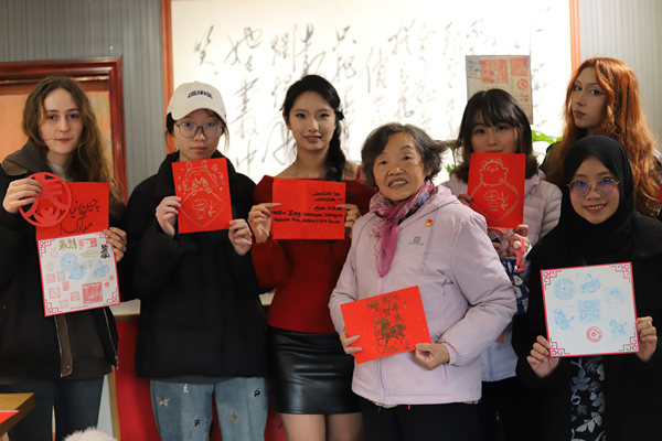 味蕾的联欢之后,是指尖上的文化相遇。活动室另一角,中外青少年们一同穿上汉服,体验中国非遗的魅力。在老师的指导下,他们小心翼翼地尝试雕版印刷,拓印出“福”字与祥瑞图案;拿起红纸与小剪刀,剪出虽显稚拙却心意满满的窗花。
