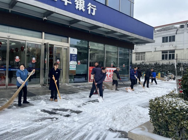 南通地区积雪覆盖广、持续时间长,通州支行等网点全员清晨集结,开展扫雪除冰志愿服务行动。员工们手持铁锹、扫帚与抹布,在门前、台阶、停车场奋力清理。一铲一铲破除坚冰,一扫一扫清出路面,并迅速铺好防滑地垫、立起警示牌,确保客户出入安全。厅堂内,暖心服务同步升级:一杯杯热茶早早备好,为客户驱散一身寒气;工作人员主动上前,细心为客户拂去衣上雪花;针对雪天出行难的老人、户外劳动者等,网点开通绿色通道,优先办理、减少等候;同时积极引导客户使用手机银行、线上渠道,细致讲解操作,让金融服务“雪中可达、指尖可达”。从户外除雪的干劲,到厅内服务的温度,南通分行让这个雪天变得暖意融融。