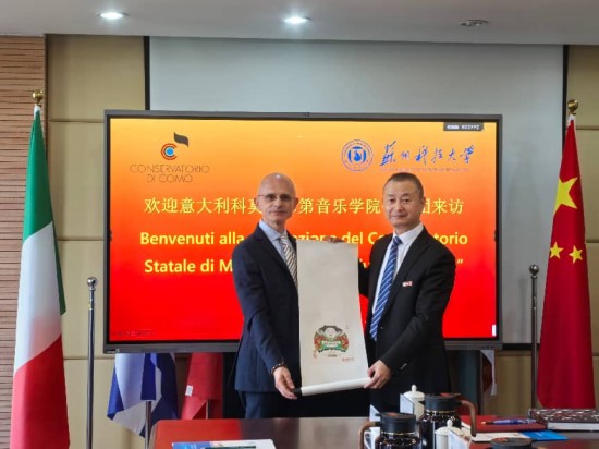 4月8日,意大利科莫威尔第音乐学院院长Vittorio Zago一行到访苏州科技大学,双方围绕音乐专业合作办学、学科建设与艺术实践展开深入交流。苏州科技大学党委常委、副校长李勇会见代表团,国际合作交流处处长钱佳、副处长范亚南,音乐学院党总支书记兼院长黄祖平,副院长刘也愚、王莹等陪同参与相关活动。