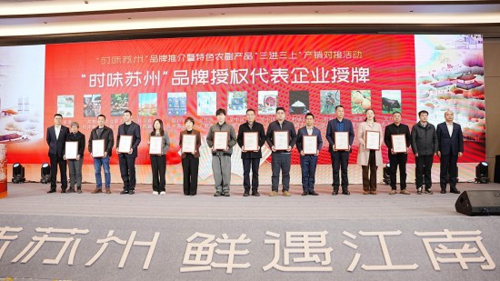 活动现场,苏州市农发集团董事长俞颂家代表主办方致辞,提出围绕“品牌化运营”要进一步打造好的产品、搭建好的平台、推动好的销售、形成好的结果,切实把“时味苏州”打造成苏州农业的标志性品牌、乡村振兴的重要载体、城市形象的闪亮名片。市农业农村局副局长宋建华作“时味苏州”主品牌推介,介绍了主品牌建设的背景意义、主品牌内涵以及未来三年主品牌建设的目标、路径和蓝图。随后,市农发集团副总经理张芬就特色农副产品“三进三上”产销对接活动作专题推介,围绕进学校、进机构、进企业、上平台、上连锁、上商综,构建从田间到餐桌、线上线下联动的全链条服务体系,推动农副产品产销对接、优产优销。同时,活动现场还发布了首批“时味苏州”40家授权企业名单,并为神园葡萄、恒洋澳龙、太湖雪、吴侬茶业、迎湖大米、苏太企业等12家代表企业授牌,通过品牌引领强化联企带农成效。