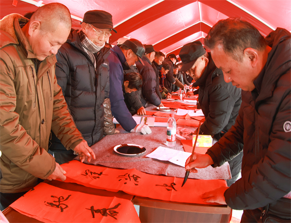 新春送福专区暖意融融,书法家们现场挥毫泼墨,“马踏祥云驮福至 花开盛世报春来”等一副副寓意吉祥的春联跃然纸上,为乡亲们定制专属年味。“手写的春联贴在门上,年味儿一下子就浓了,希望新的一年日子红红火火。”拿到春联的村民刘云喜笑颜开。