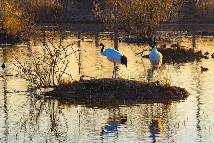 在生活习性上,丹顶鹤常成对或成家族群、小群活动,迁徙期和越冬期则会结成数十只甚至上百只的大群,但活动时仍以小群或家族为单位分散觅食。它们是杂食性鸟类,除了捕食水生生物,也会采食水生植物的种子、茎、叶,冬季还会到农田啄食谷物;休息时多单腿站立,将头转向后方插入背羽间,警惕性极高,一旦察觉危险便会腾空飞翔,鸣声高亢洪亮,可传至3至5千米外。值得一提的是,丹顶鹤实行严格的“一雄一雌制”,配偶关系可维持数十年,繁殖期会通过对鸣、舞蹈等行为求偶,巢多筑于水深5至25厘米的芦苇丛中,每窝产卵2枚,由雌雄亲鸟轮流孵化,雏鸟出壳后不久便能行走、游泳,生长速度较快。
