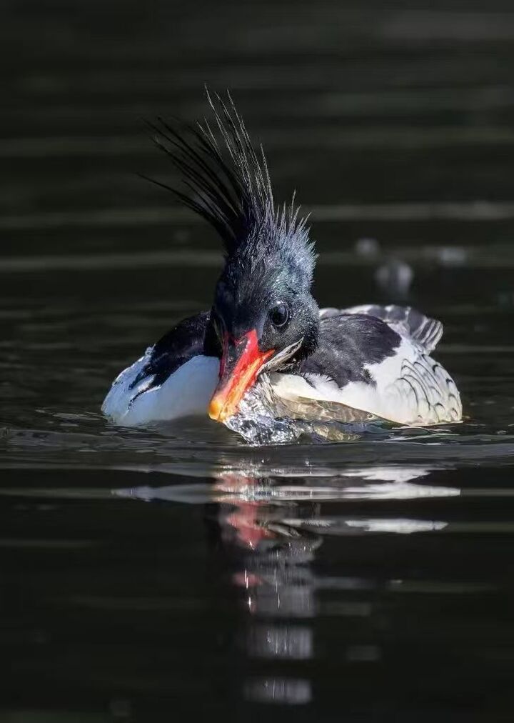 2月23日,沭阳新沂河湿地波光粼粼。水面上,几只中华秋沙鸭正优雅游弋,时而潜入水中捕食,时而梳理羽毛,黑色冠羽与两胁“祥云”状斑纹在阳光下格外醒目。这是首次在沭阳境内明确记录这一国家一级保护动物。