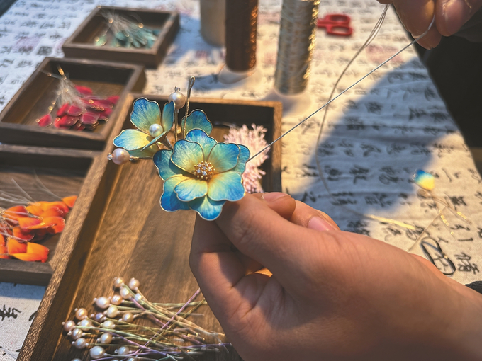 “除了参加市集外,我大部分时间都在潜心研究作品。”“梅里好市”绒花缠花摊主陈浩介绍,今年他的作品一改以往纯传统风格,向现代风转型。例如将传统扁款牡丹升级为立体造型,把传统细绒工艺改为掐丝工艺,让作品更立体坚挺,也更耐用。同时,他还将绒花、缠花两项非遗技艺融合创新。陈浩认为,只有主动贴近年轻人的喜好并融入创作,才能在市集上吸引更多游客。