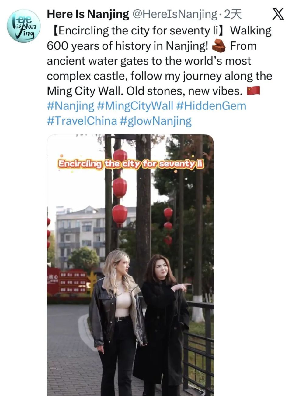 Here Is Nanjing关注海外游客的在宁旅游体验,发布《环城七十里:漫步南京城墙,感受六百多年历史》《越南游客爱上南京啦!现场说中文超可爱》等一批视频和图文,展现南京新春文旅的国际吸引力。