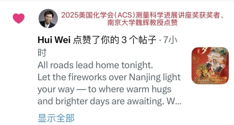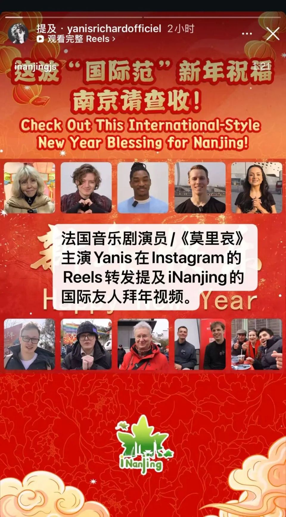 iNanjing打造双语原创视频《这波“国际范”新年祝福,南京请查收!》,聚合了芬兰驻上海总领事、法国音乐剧演员、爱尔兰舞者及多位在宁国际友人的新年祝福,播放量超3万次,点赞互动超300次,被法国音乐剧《莫里哀》主演亚尼斯、爱尔兰舞剧《大河之舞》主演费格斯等人点赞转发。此外,iNanjing从除夕至大年初五推出的春节系列海报,还获得南京大学教授、美国化学会(ACS)2025年度测量科学进展讲座奖获奖者魏辉的点赞支持。