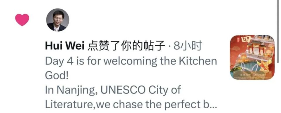 Discover Nanjing紧扣南京新春线下活动,全方位展现南京春节的时尚活力与城市魅力,获联合国新闻秘书埃尔娜拉·巴伊纳扎罗娃点赞,秘鲁移动可持续发展咨询机构点赞、转发。账号同时聚焦南京特色文化体验,分享江宁织造博物馆的“大梦·红楼”沉浸式演出,获得西班牙演讲者、选美比赛教练亚历山大点赞并转发;账号还发布了南京饮马巷年俗视频,还原老城新春烟火气息,获巴利阿里群岛高级音乐学院教授点赞。