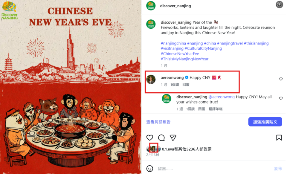 南京海外社交媒体账号Discover Nanjing、iNanjing、Here Is Nanjing同步发力,通过海报、视频、图文等多元形式,在海外平台全方位展示南京“年味”,不仅引发广泛关注,更吸引中国驻外大使馆、海外机构、国际名人等影响力账号互动。
