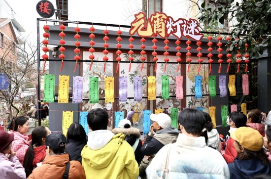 上午十时许,熙南里街区入口与民俗馆前,工作人员将一碗碗象征团圆的免费元宵递至市民、游客和商户手中。与此同时,街区定盘巷和甘家大院的飞檐翘角下、老城南的砖木廊檐间,数百盏精巧花灯次第亮起,灯下悬挂的彩笺谜题吸引众多游人争相竞猜。