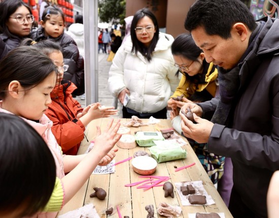 午后,“马跃金陵 花好月圆”主题活动将节庆氛围推向高潮。主街设立的非遗手作工坊成为亲子家庭的热门打卡地,剪花映月(剪纸)、泥塑良驹(泥塑)、拓印团圆(拓印)、锦绣前程(布艺)四个项目轮番登场。非遗传承人与资深教师现场教学,带领参与者亲手创作马年主题作品。每个整点进行的非遗知识问答,更在互动中传递传统文化精髓,让古老技艺在指尖获得新生。