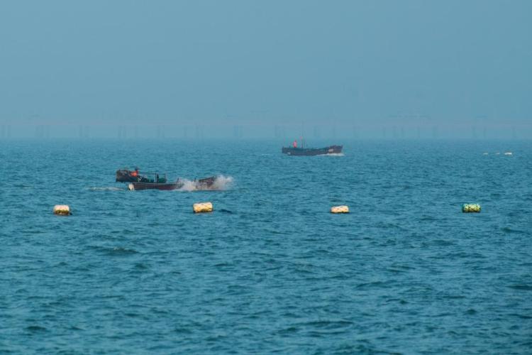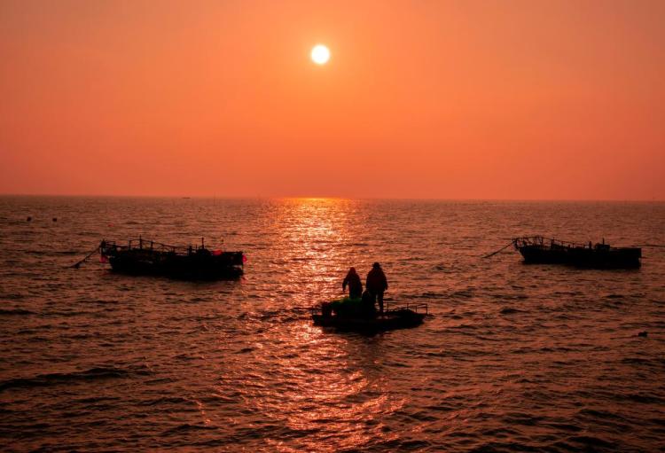 江苏省如东县长沙镇的渔民赶往30海里外的作业船上捕捞鳗鱼苗。