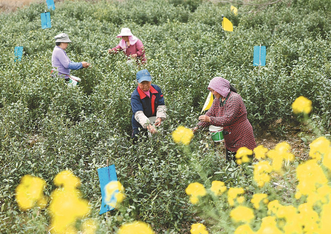 近年来,南京江北新区十里清峰茶场以茶为媒、以茶兴业,推动茶产业规模化发展,实现生态效益与经济效益双丰收,让一片茶叶成为乡村振兴的“金叶子”。图为4月2日,茶农们正在采摘、制作明前雨花茶,供应市场。 新华日报 记者 赵亚玲 黄晓娟 摄