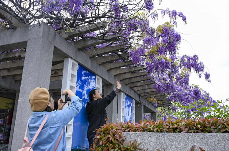 4月7日,玄武湖公园情侣园紫藤花架繁茂盛开,如梦如幻的紫色云霞与湖岸、城市天际线相互映衬,吸引众多市民游客打卡拍照,感受四月天里的最美风景线。(南京日报/紫金山新闻 记者 孙中元)