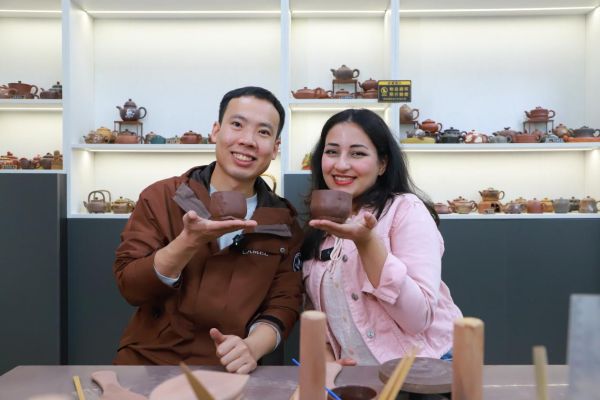 原矿选材、手工揉泥、精雕细琢、烧制成型,安特夫妇在了解传统制作工序后,上手体验制作紫砂陶器。安特直言:“这是我第一次接触到宜兴紫砂陶器,师傅告诉我这项制作技艺已有百年历史,我自己尝试了一下,太有挑战性了,这就是中国顶级美学的魅力。”