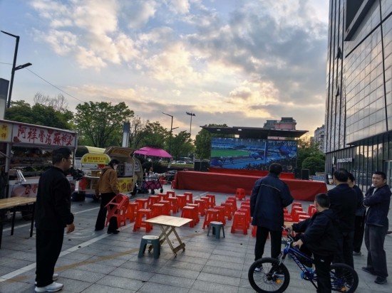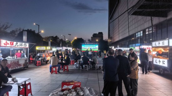 傍晚时分,茂业百货南广场已热闹非凡。城管队员提前规划场地布局,设置高清大屏直播区、美食集中展示区、文明观赛引导区,通过科学划分功能区域保障活动有序开展。执法队员化身“服务管家”,不仅对广场周边环境进行精细化整治,还主动对接流动经营从业者,将分散的小吃摊主集中引导至指定区域规范经营。鸡蛋灌饼、麻辣烫、泡椒牛蛙等特色小吃齐聚一堂,香气四溢的烟火气让观赛现场更具亲和力。